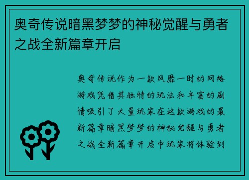 《奥奇传说》作为一款风靡一时的网络游戏,凭借其独特的玩法和丰富的剧情吸引了大量玩家。在这款游戏的最新篇章——《暗黑梦梦的神秘觉醒与勇者之战全新篇章开启》中,玩家将体验到前所未有的冒险与挑战。这个新篇章不仅对游戏的故事情节进行了深刻的扩展,还引入了新的角色与任务系统,为游戏的玩法带来了全新的体验。本文将从四个方面详细阐述《奥奇传说》新篇章的精彩内容,包括暗黑梦梦的觉醒、勇者之战的启程、新的任务系统与角色发展、以及该篇章如何深化游戏世界观与玩家之间的互动。通过这些角度的分析,玩家可以更加全面地了解这一全新篇章带来的魅力。